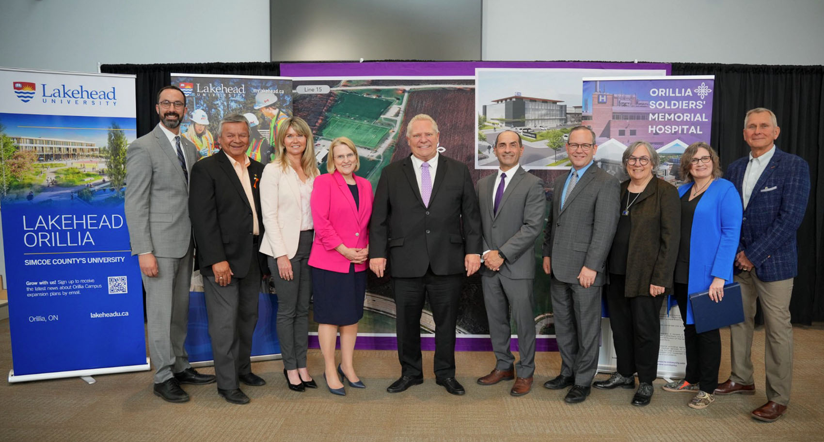 Ontario Premier Doug Ford with Ontario Deputy Premier and Health Minister Sylvia Jones with officials of from the City of Orillia, Lakehead University and Soldier’s Memorial Hospital at a Friday May 23, 2025 announcement.