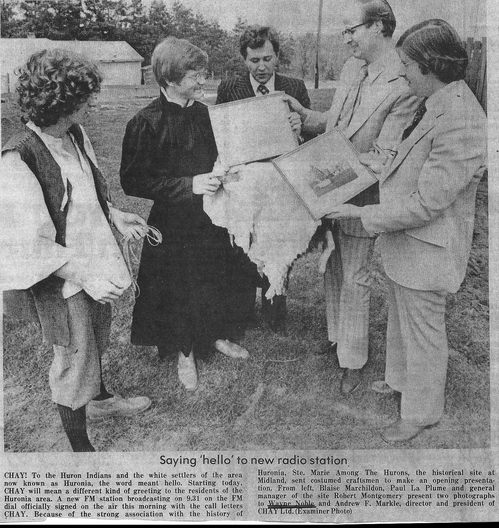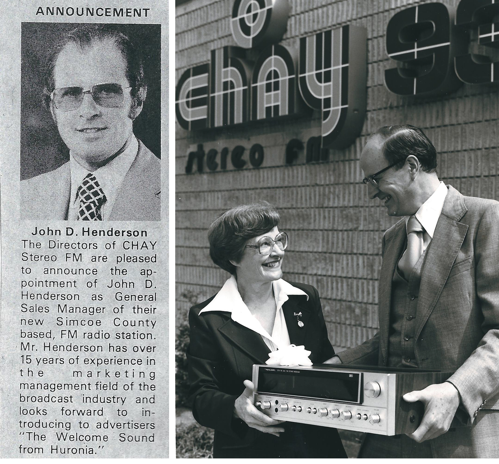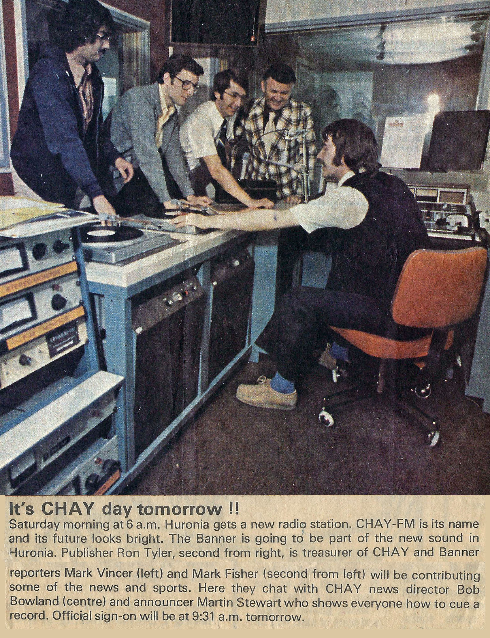 At the beginning in 1977 CHAY offered a beautiful music format with a strong news and information component.  Three times a day, CHAY listeners tuned to “Huronia Magazine,” a one-hour regional comprehensive digest of the day’s events beginning with a major newscast followed by multiple produced feature interviews delivered by CHAY news staff members and regional correspondents. These well produced reports introduced listeners to Central Ontario residents and community leaders and highlighted matters of importance in agriculture, business, special interest, sports, politics, traffic and weather along with letters to the editor and commentaries.