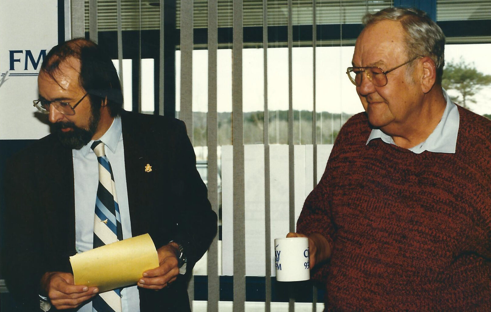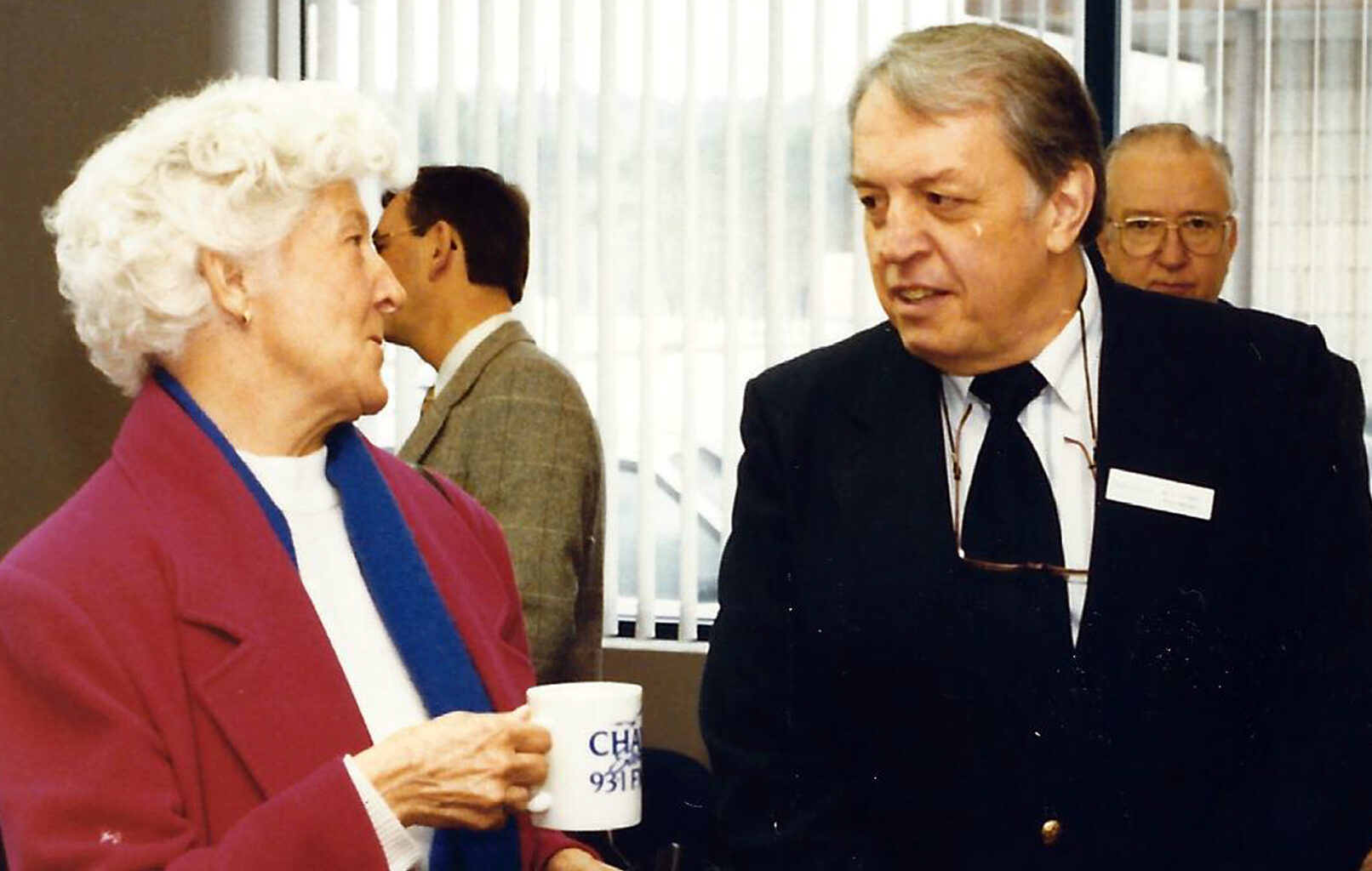 CHAY-FM’S Milt Conway speaks to a guest at our open house. (Barrie Canadian Tire owner and CHAY shareholder Arch Brown is in the background!)