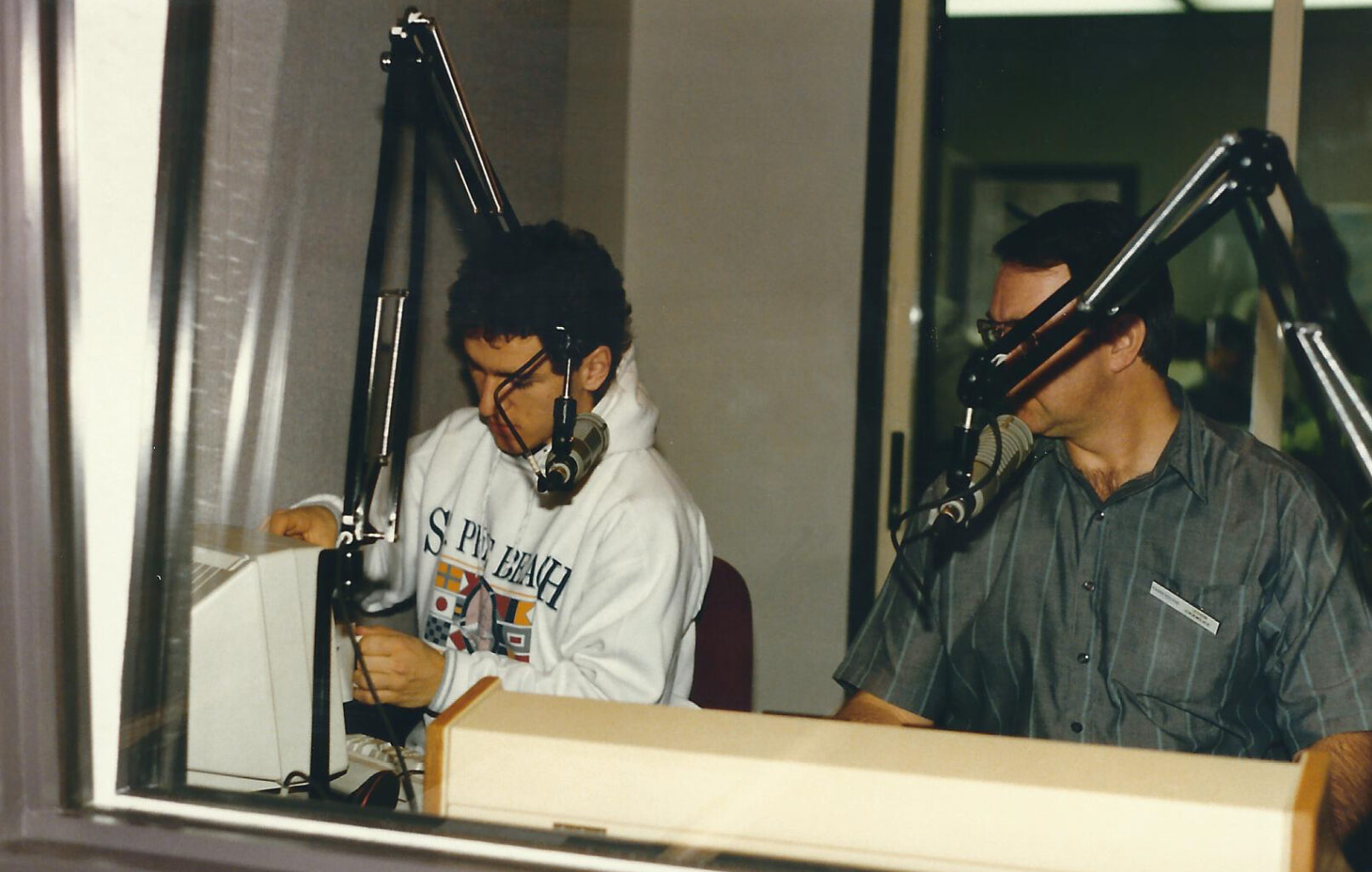 Three time World Champion figure skater Elvis Stojko and CHAY-FM Sports Director John Crawley prepare for an on-air interview