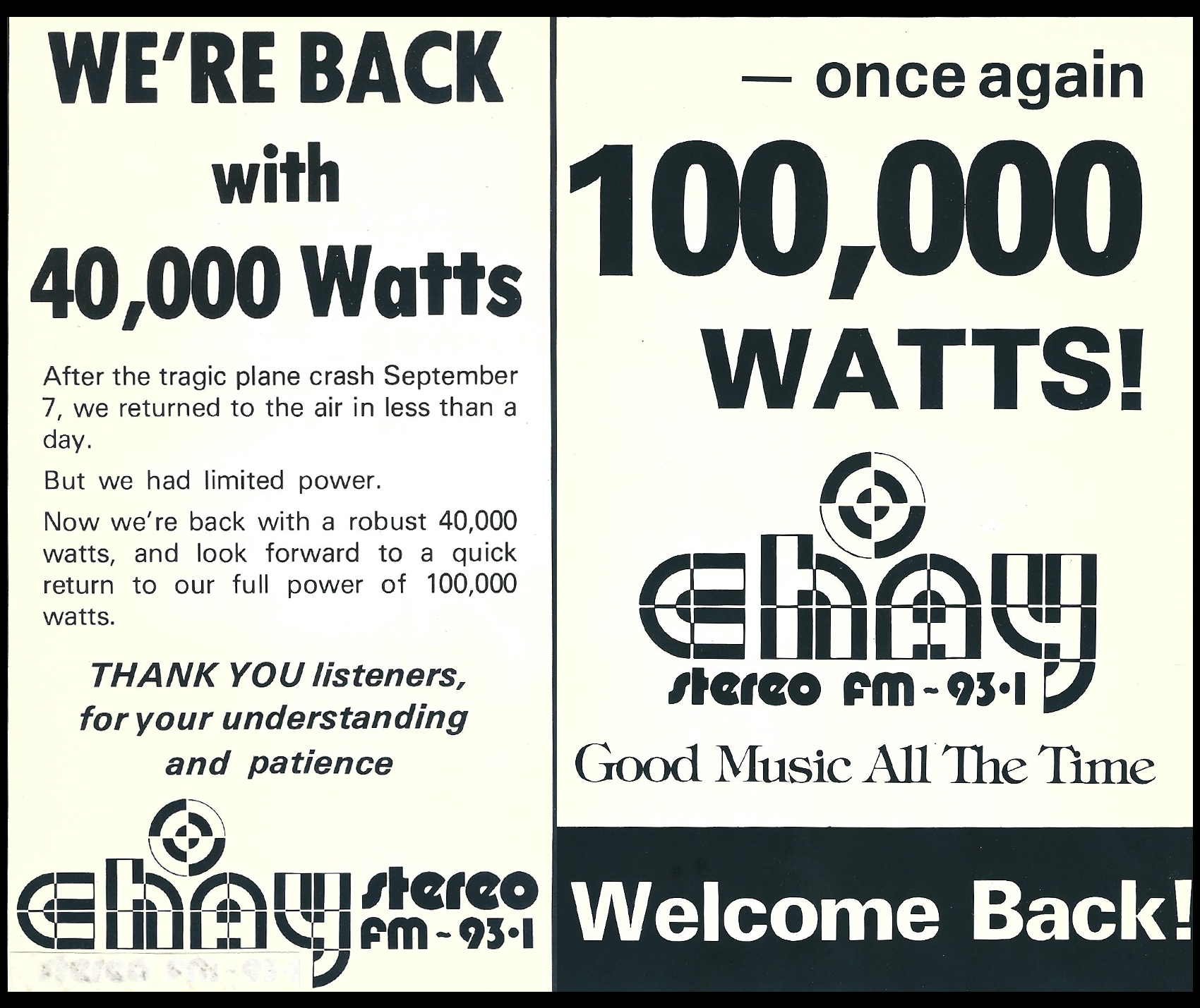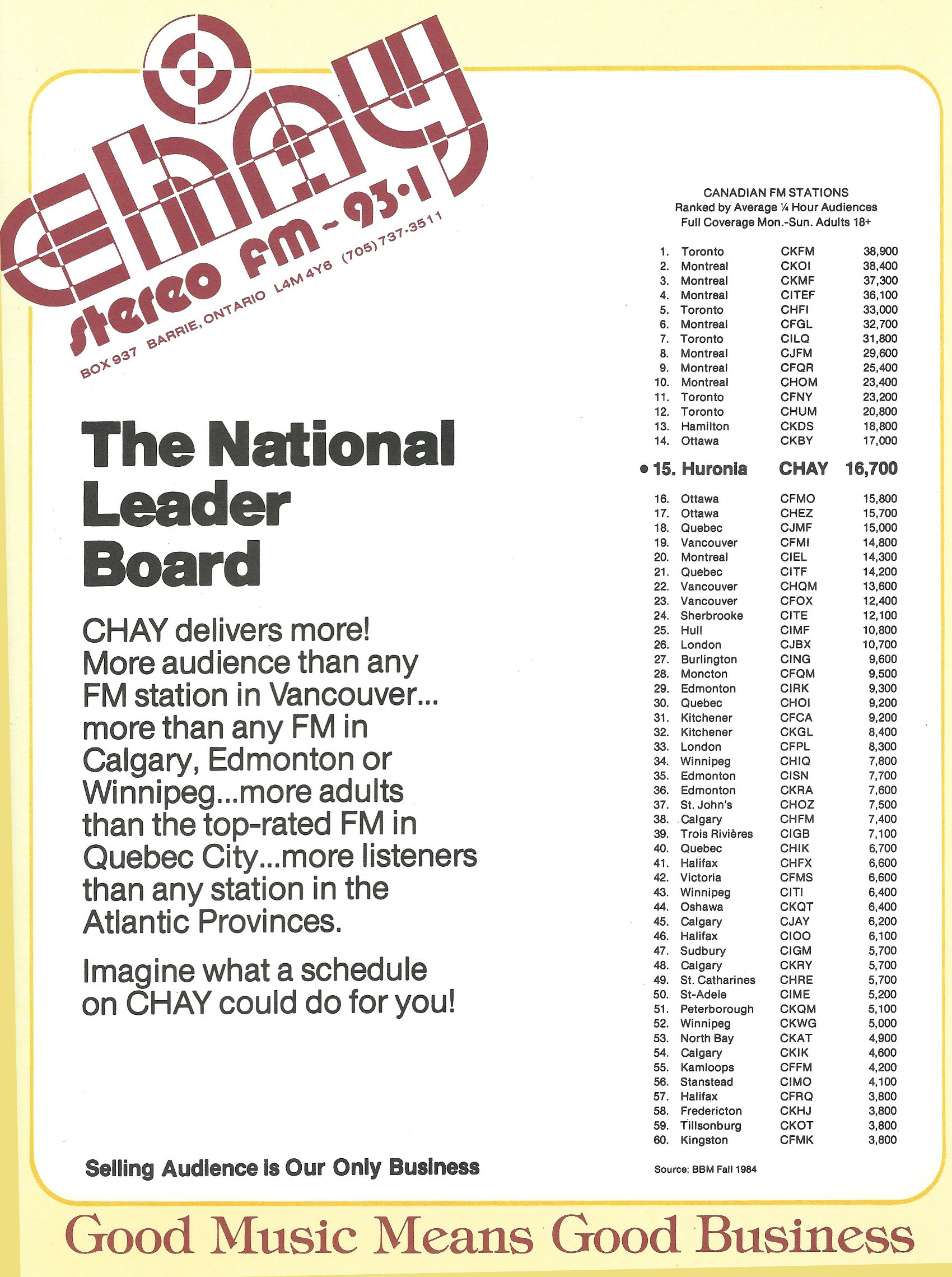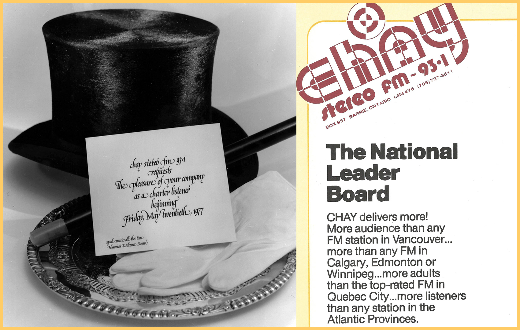 From day one, CHAY was off to the races as a regional radio force.  The operation survived being wiped off the air by the destruction of the CKVR broadcast tower, returning soon after and broadcasting at greatly reduced power from a backup antenna attached to a temporary structure on the television station’s property. Highlighting the quality of ownership and dedication to the well-being of the recently hired staff, there were no layoffs as the new station struggled to stay on its feet following the tragic plane crash. Despite this major setback, the new FM radio station quickly became one of the highest rated stations in Canada.